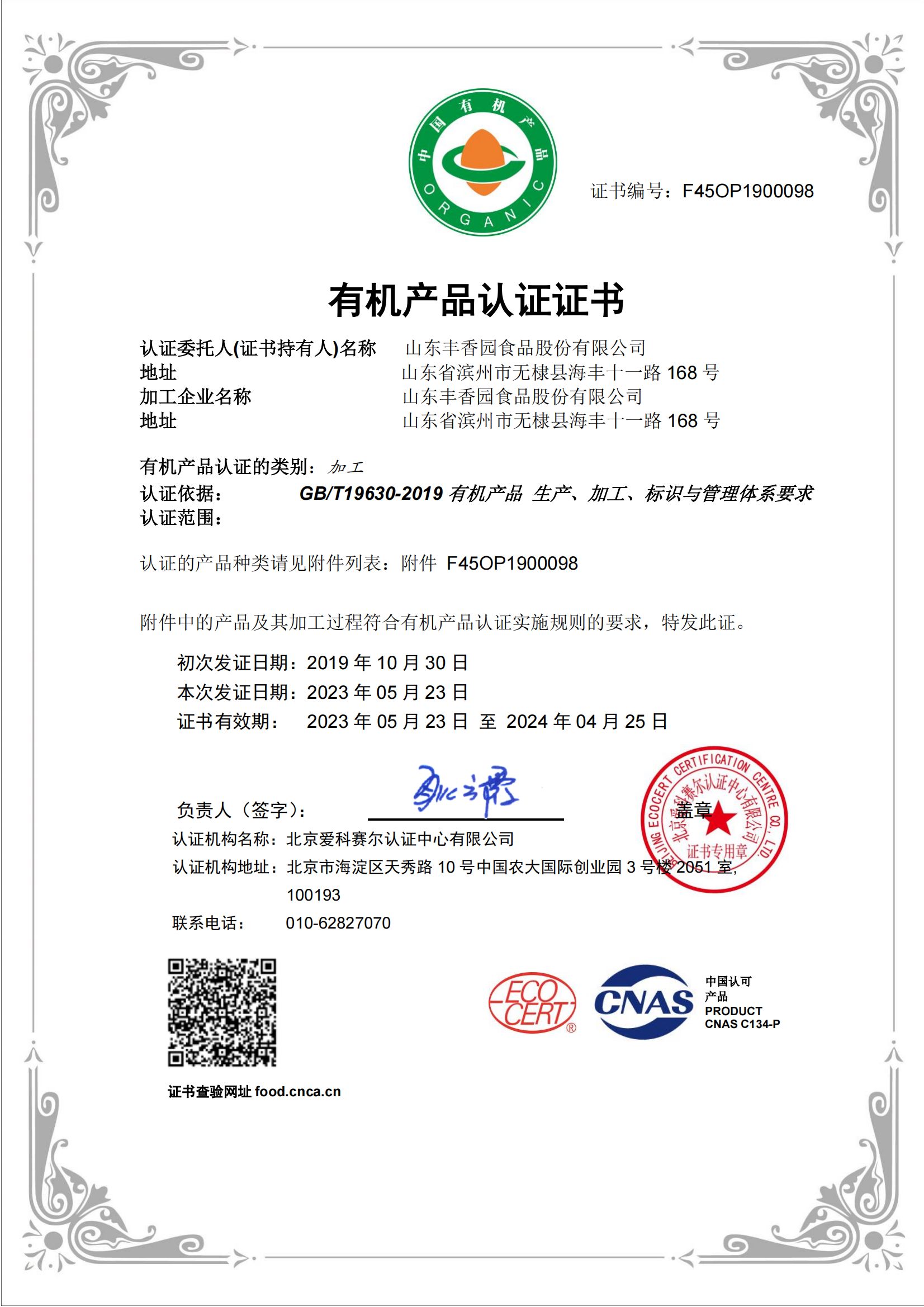 公司獲得HACCP國(guó)際質(zhì)量體系認(rèn)證、ISO9001:2015質(zhì)量管理體系認(rèn)證,產(chǎn)品獲得美國(guó)FDA認(rèn)證、美國(guó)、歐盟有機(jī)食品認(rèn)證、英國(guó)BRC體系認(rèn)證、A級(jí)綠色食品認(rèn)證、GB國(guó)標(biāo)有機(jī)食品認(rèn)證。